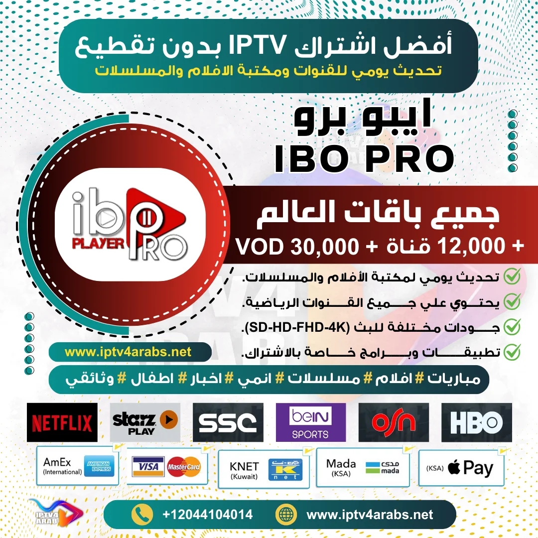 https://play.google.com/store/apps/details?id=com.ibopro.player&hl=ar - إذا كان جهازك Apple TV أو iPad أو iPhone، يمكنك تحميل التطبيق من الرابط التالي: